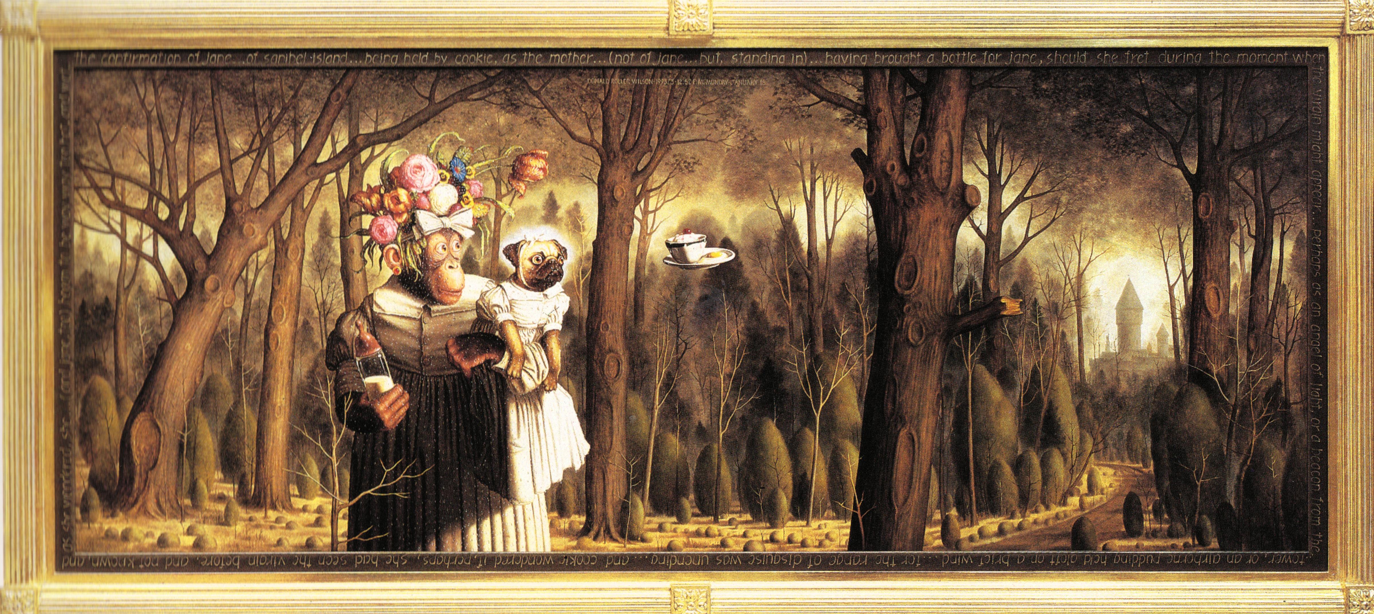 Donald Roller Wilson Cookie as the Mother...(But only standing in)…Holding jane...and trying to soothe her...(During an appearance of the virgin in disguise)…,1993, oil on canvas, oil on wood, 35 x 77 inches